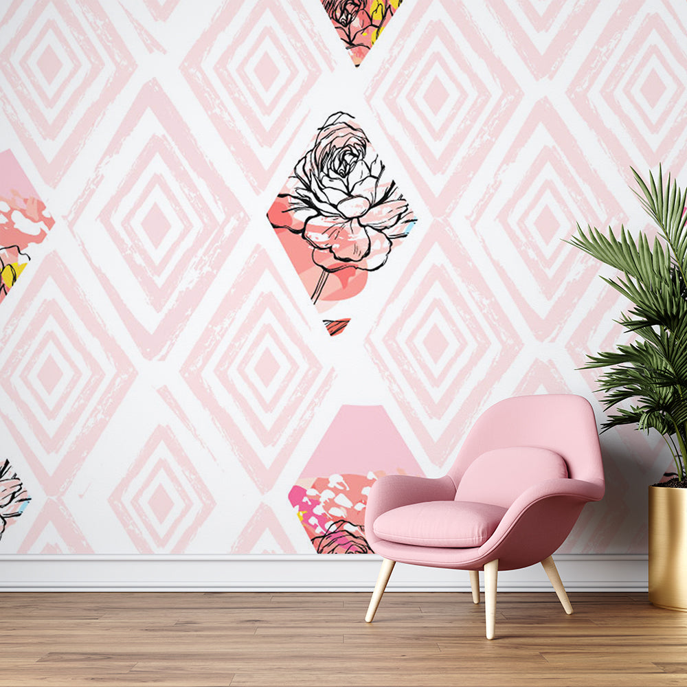 Here’s a twist on the standard floral or geometric wallpaper design! The floral patterns break the monotony of the concentric rhombuses and are a perfect way to add some unique character to your wall. Perfect for any furniture of your choice, this mural will be the star of the show and create a dynamic effect within the space.