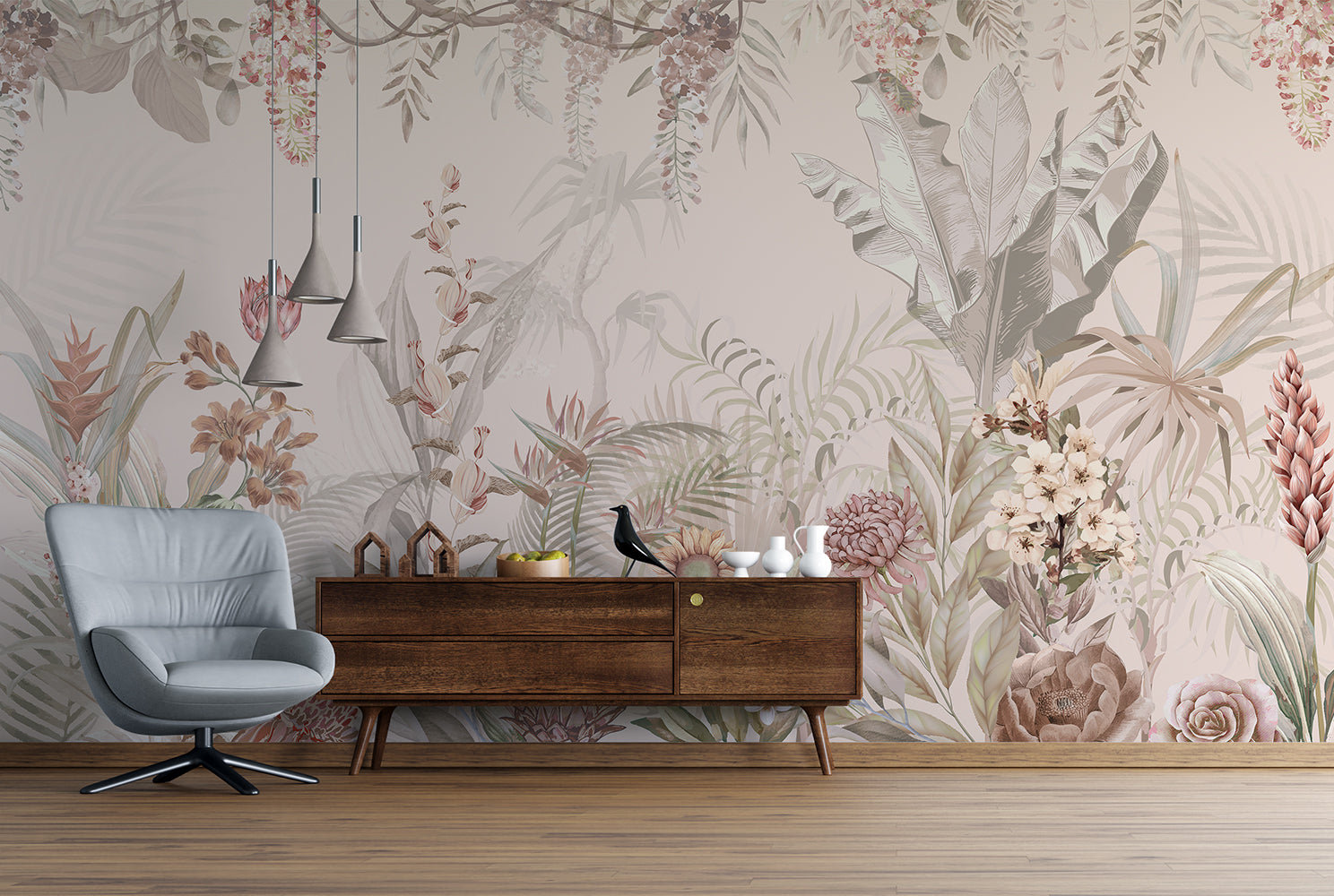 Blooming Garden wallpaper fills your space with delicate blossoms and leafy accents, perfect for cozy sunrooms, bedrooms, or creative studios.