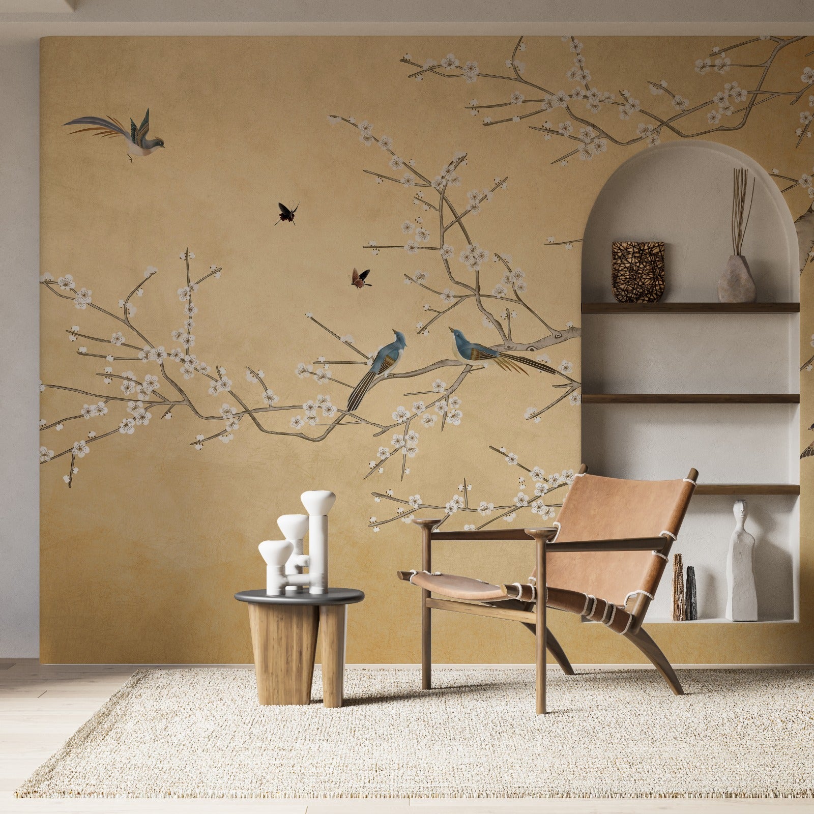 The 'Cherry Blossom' wall mural art presents a captivating scene of vibrant birds and delicate white flowers blooming on a branch, set against a backdrop of rich, dark beige. The colors truly stand out, adding a touch of allure to any accent wall in living rooms, entrance foyers, or hallways. These landscape murals infuse the accent wall with a unique combination of personality and charm, captivating the attention of all who behold it.