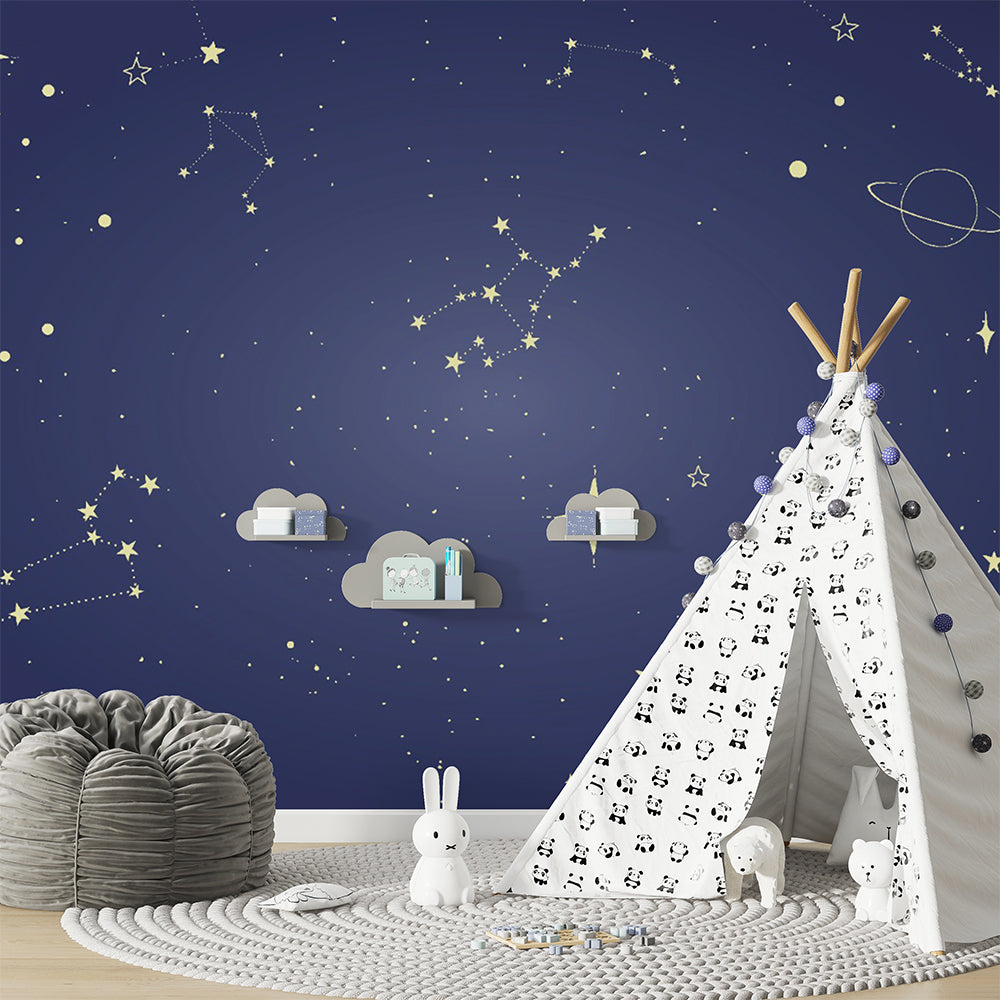 Constellation wallpaper inspires wonder about the universe—ideal for calming, celestial-themed nurseries and study spaces.