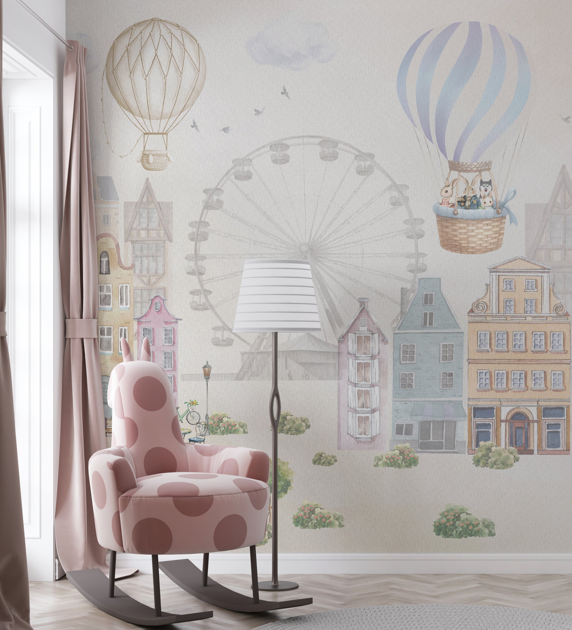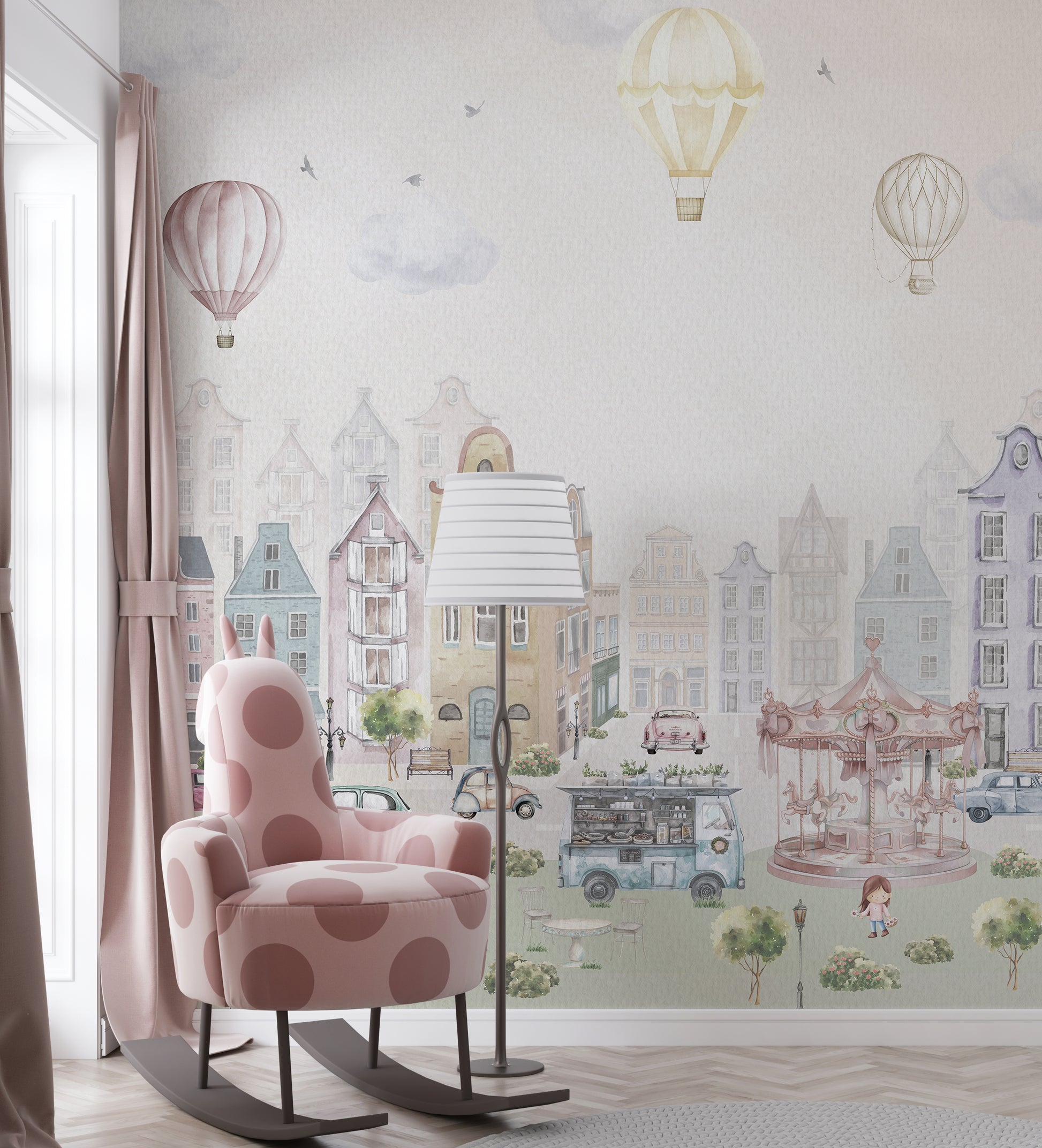 Buy Dreamy Town Square wallpaper online on Digital Walls. Cozy buildings and cobbled streets create storybook charm perfect for sparking young imaginations.