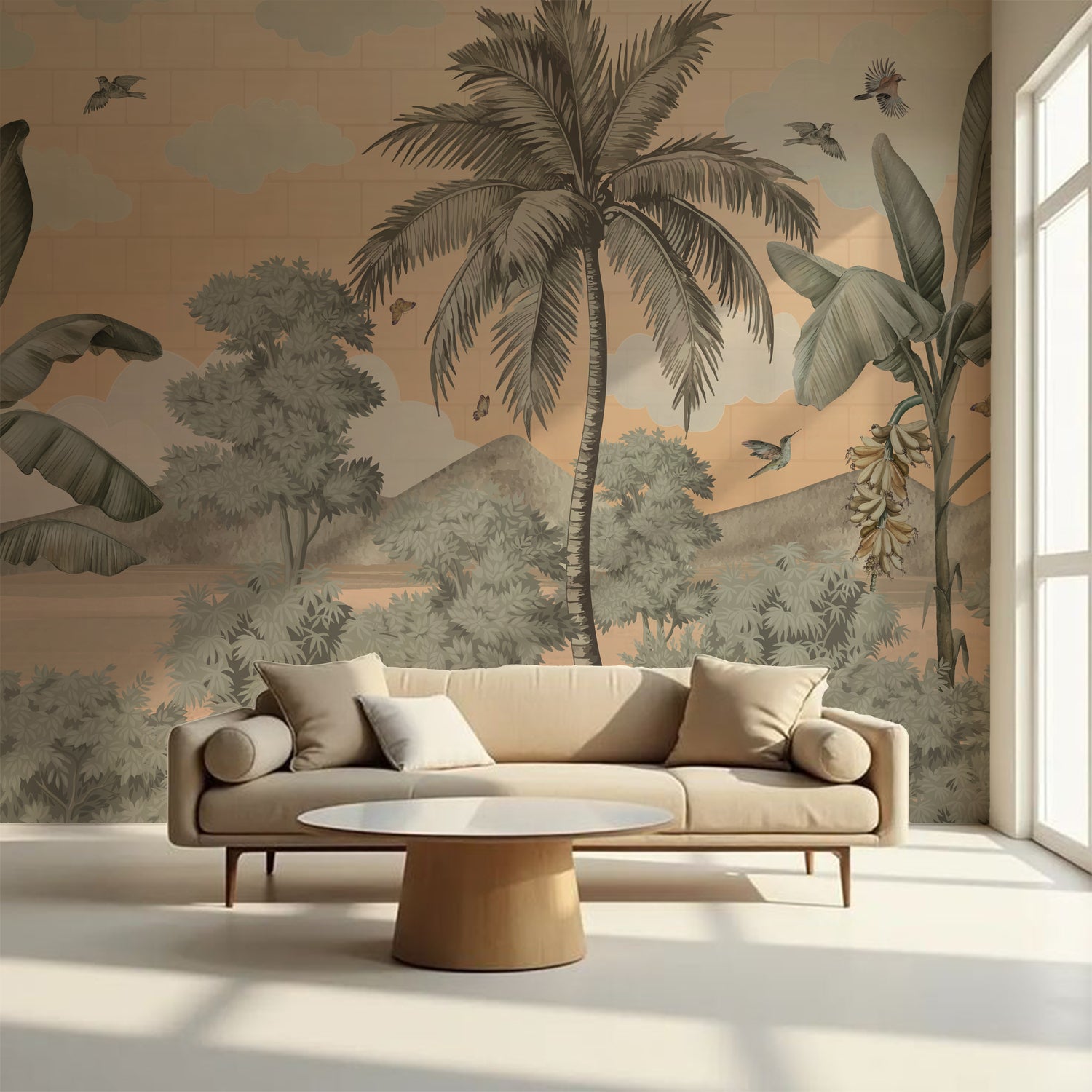 Faded Fauna wallpaper blends soft tropical patterns in washed, earthy tones. Its gentle look makes it versatile, bringing understated elegance to tropical-inspired rooms.