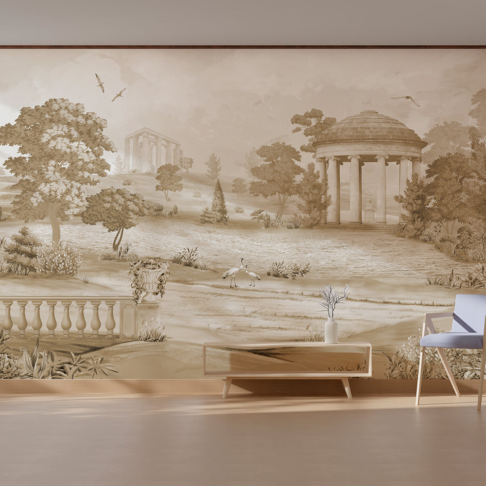 Buy Golden Arcadia wallpaper online on Digital Walls. Roman artistry meets lush tropics with palm vistas and golden accents, adding timeless luxury to your walls.