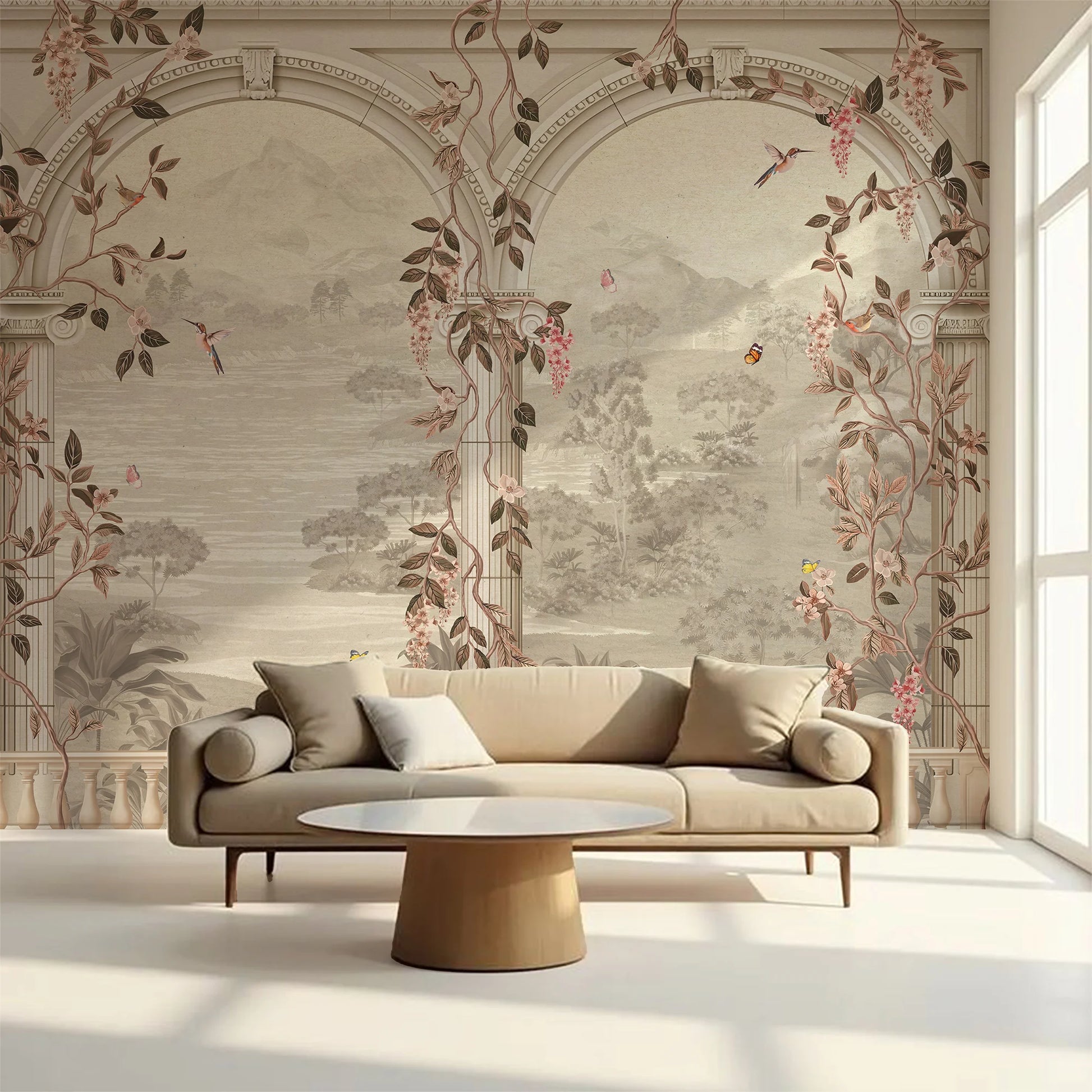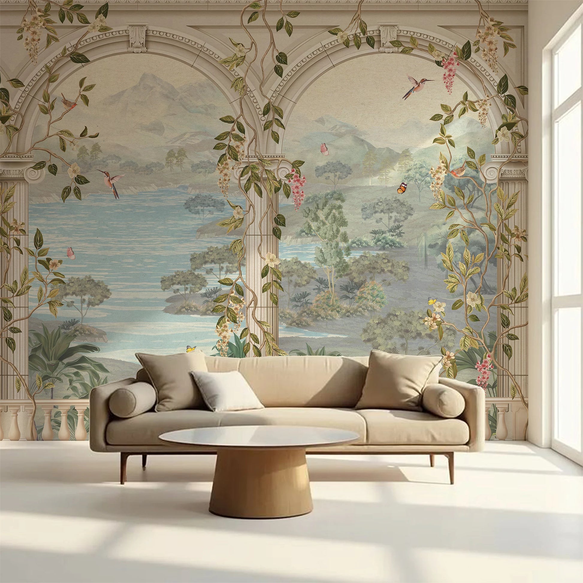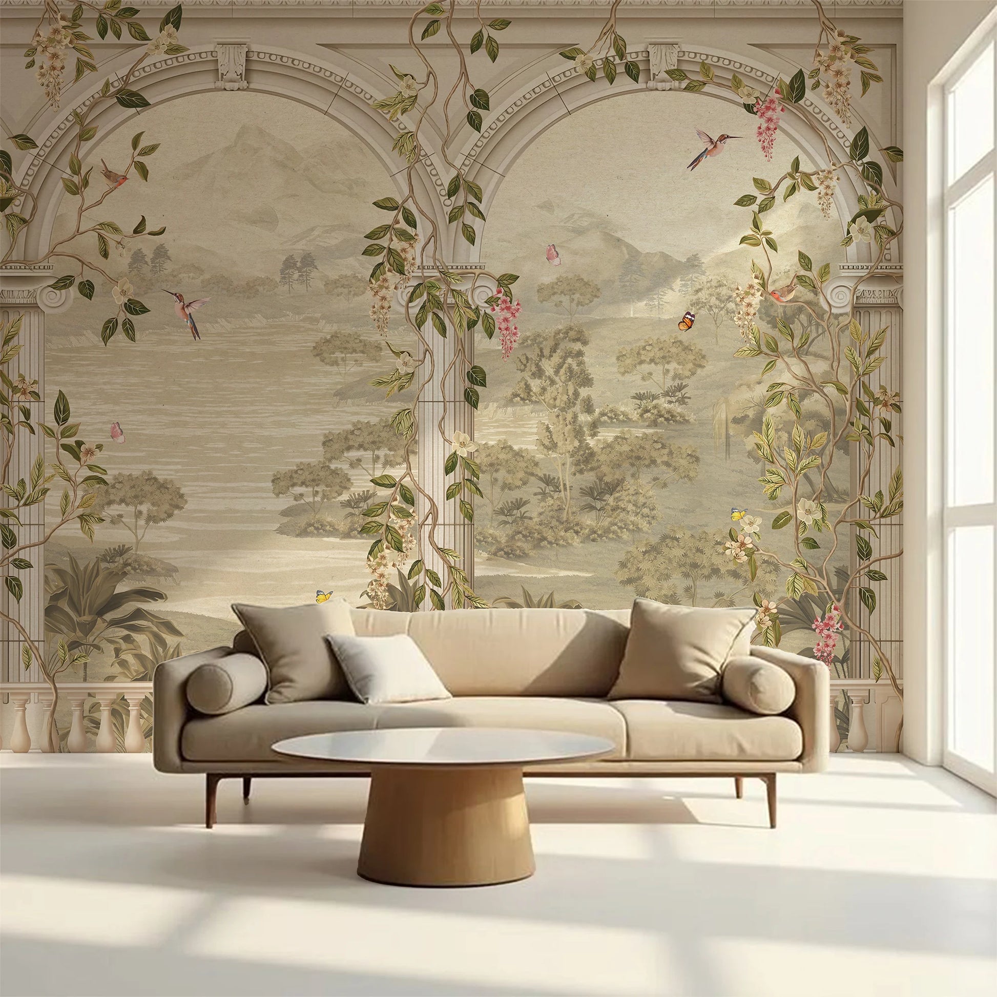 Hummingbird Veranda Wallpaper captures the lively energy of nature with delicate hummingbirds fluttering among lush greenery. A refreshing design, it brings lightness and vitality to tropical-inspired interiors.