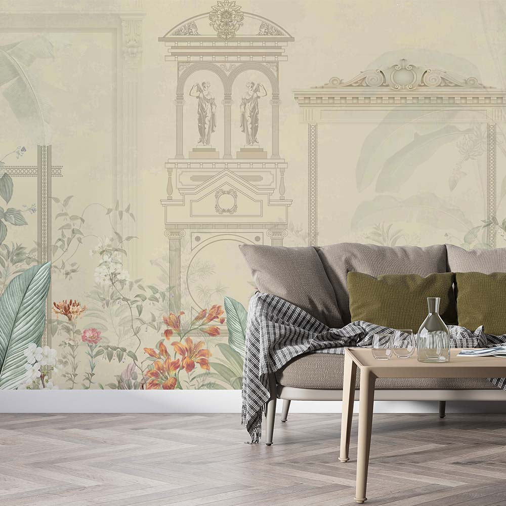 The 'Imperial Garden' wall mural art showcases ornamental garden sculptures and gateways, nestled within a beautifully landscaped garden adorned with stunning flora and fauna. The mural exudes a vintage charm with its green-hued backdrop and an abundance of warm-hued flowers, adding a burst of color. For those who deeply appreciate the art and craftsmanship of ancient Rome, these classic wallpapers serve as the perfect choice for enhancing any wall in your home.