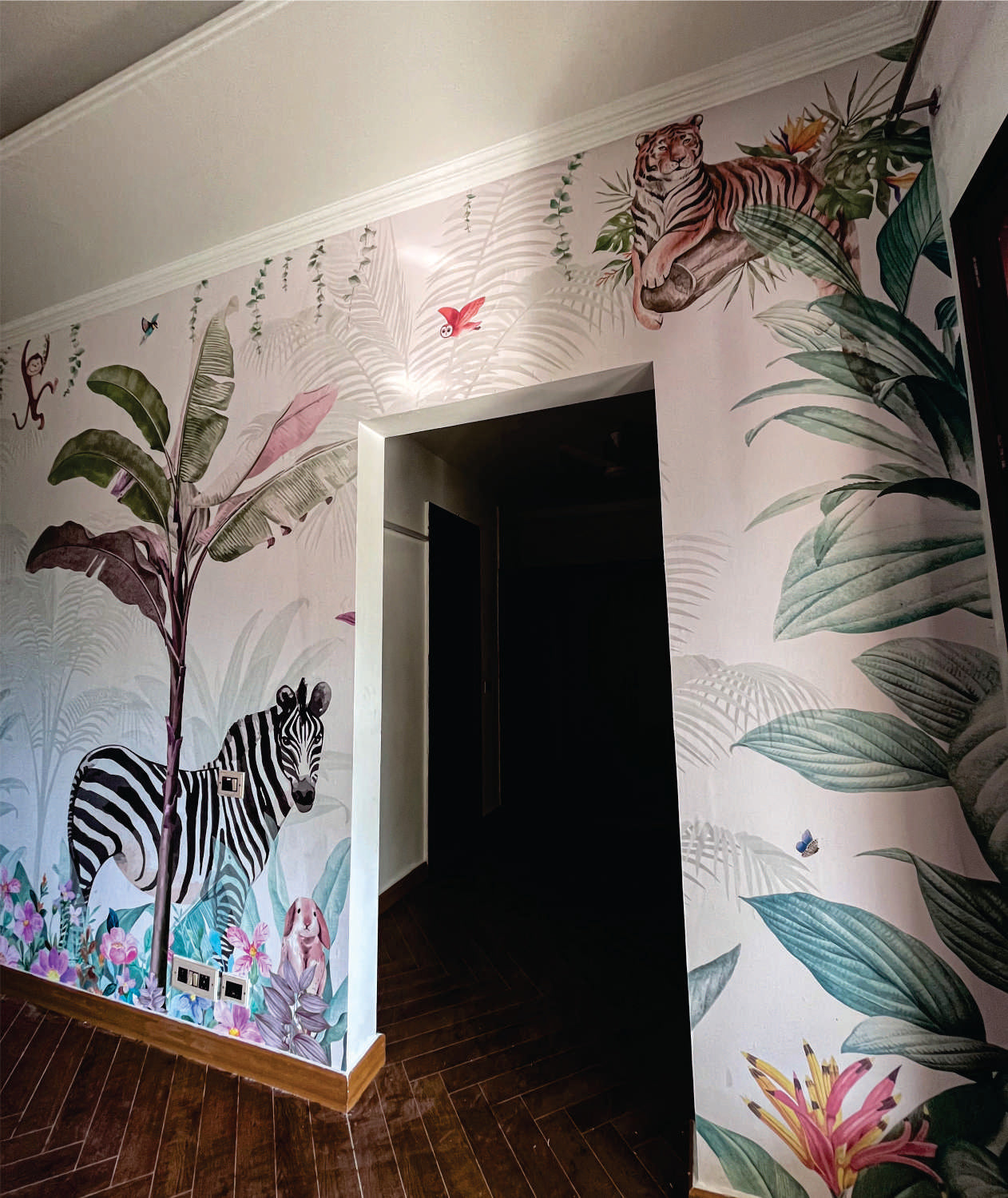The Jungle Village is a lush and vibrant habitat for an array of fascinating wildlife. This stunning jungle themed wallpaper design showcases a variety of creatures, including a majestic giraffe, a graceful zebra, a mighty elephant, a flamboyant flamingo, a majestic tiger, playful monkey. Perfect for children's nurseries, this wallpaper provides a fun and educational way for kids to learn about different animals while adding a spectacular touch to their room's decor.