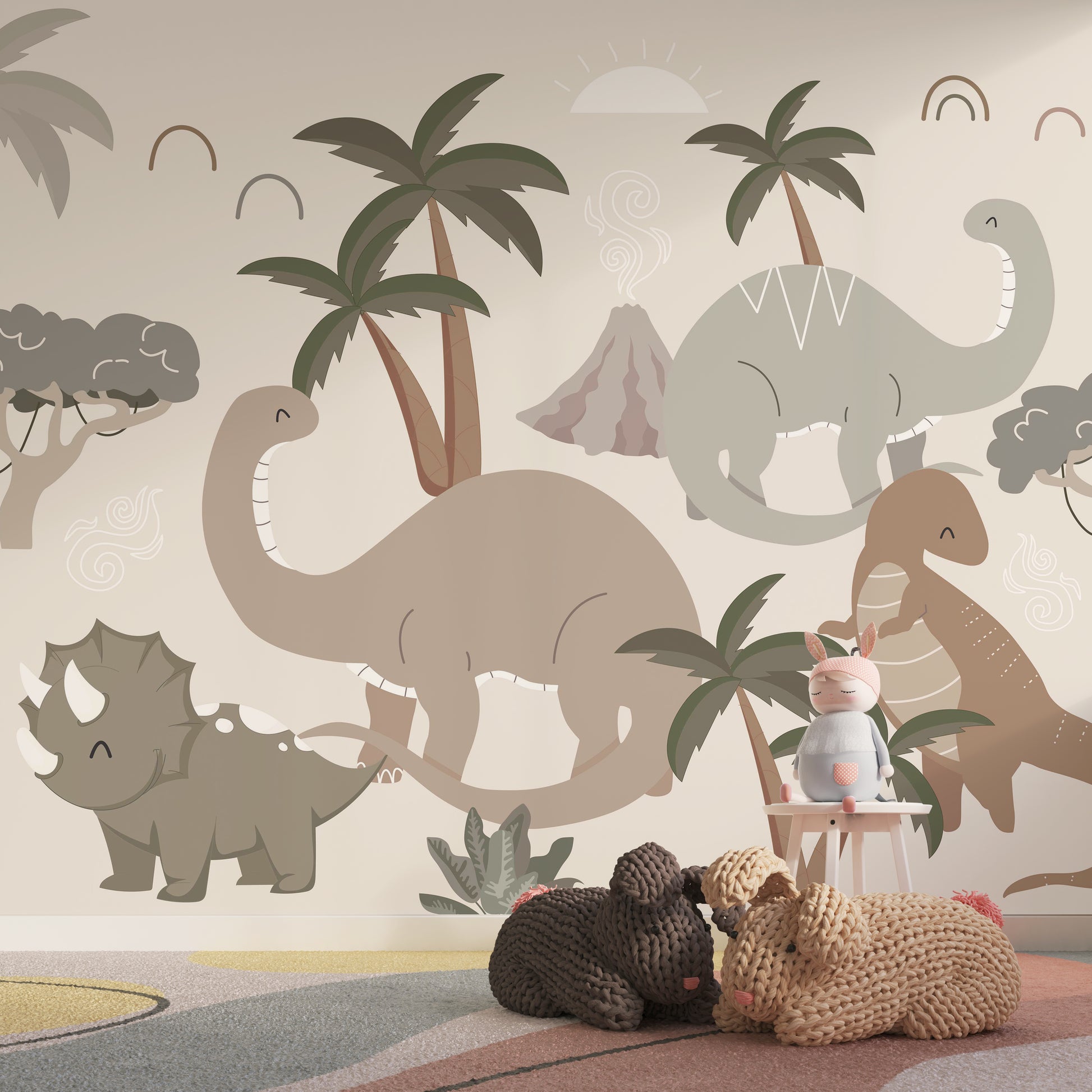 Jurassic Gentle Wallpaper from the Kids Collection features calm, adorable dinosaurs in soothing colors, creating a playful yet comforting space perfect for nurseries and kids’ rooms.