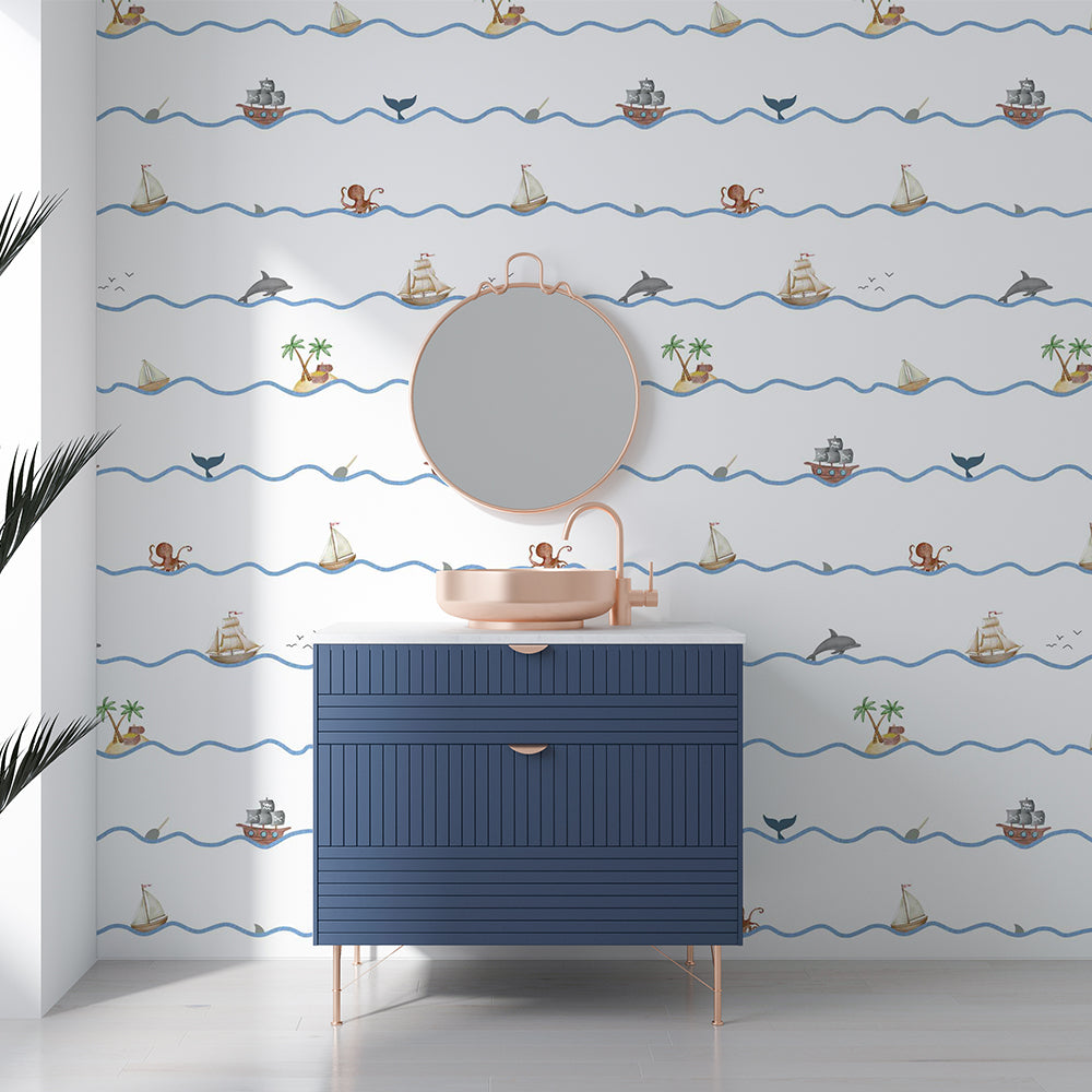 Little Mariner Wallpaper creates a sea-inspired adventure with boats and ocean elements, perfect for kids who love the calm and curiosity of the seaside.