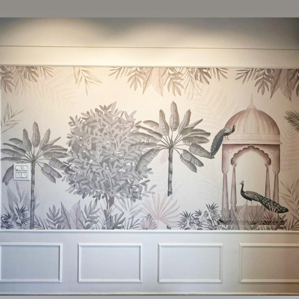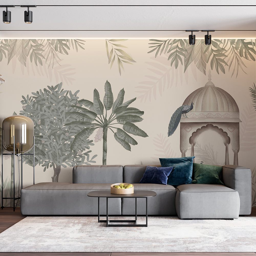 Madhuban wallpaper creates a lush, earthy backdrop with cultural richness—great for lounges or feature walls.