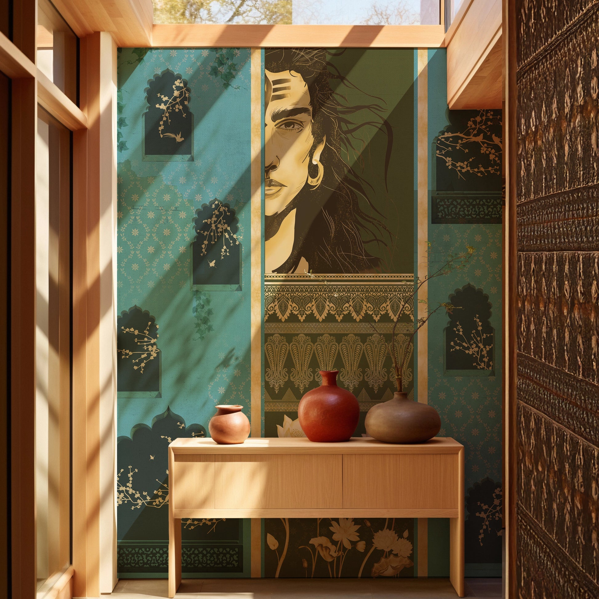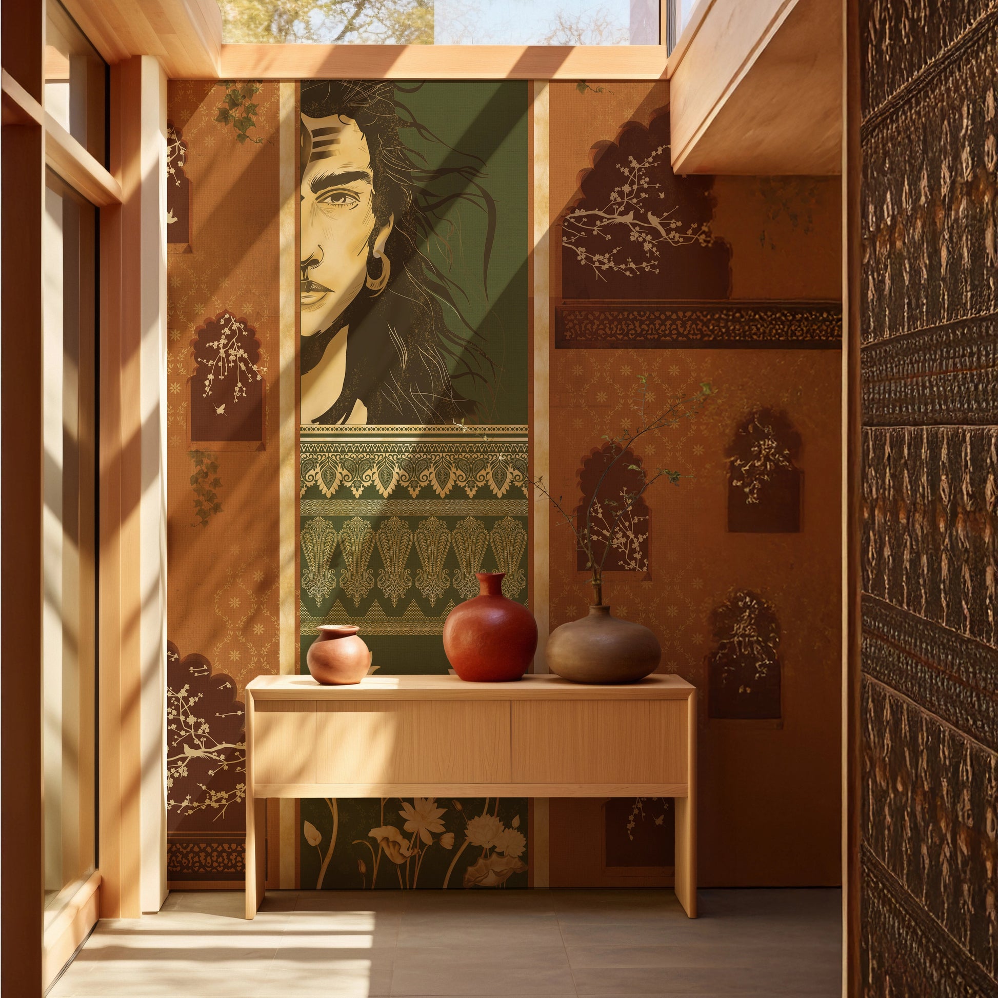 Modern Entryway wallpaper reimagines Banaras patterns with a sleek, minimal touch. Perfect for transitional spaces, it fuses heritage detailing with a modern aesthetic, creating a warm, welcoming ambiance.