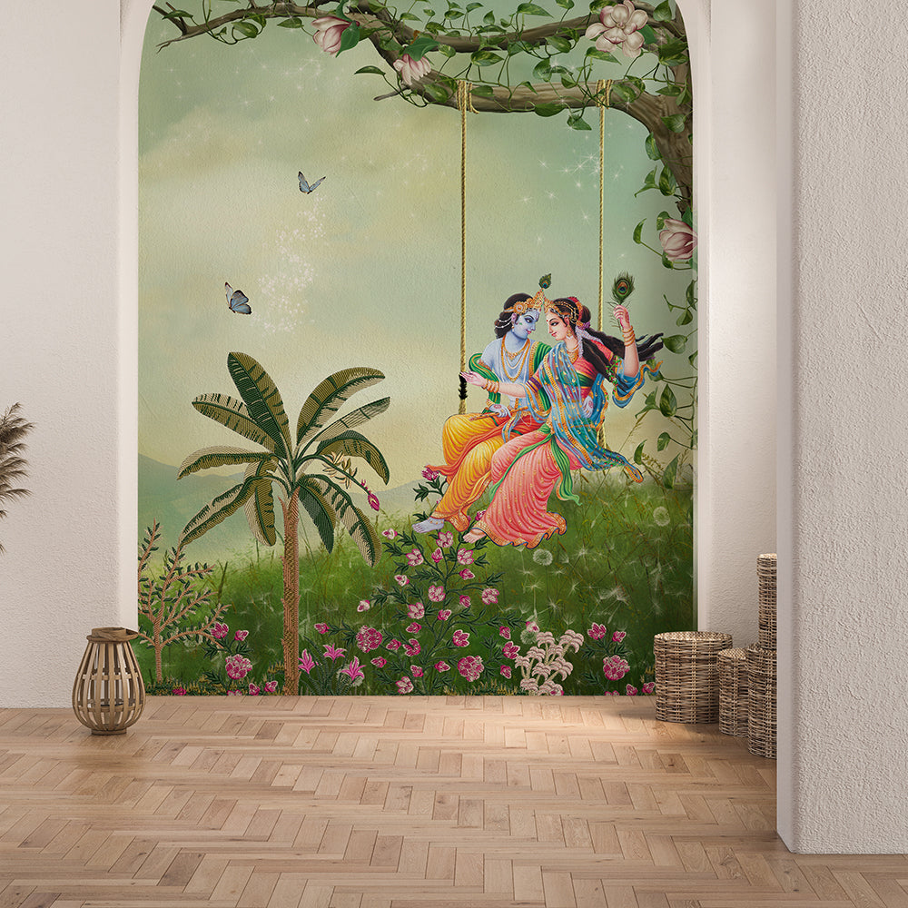 Radha Krishna Mural Wall Art beautifully depicts the eternal love and spiritual harmony of Radha and Krishna. Inspired by traditional mural artistry, it combines divine symbolism, vibrant colors, and intricate detailing, making it a sacred and serene addition to any space.