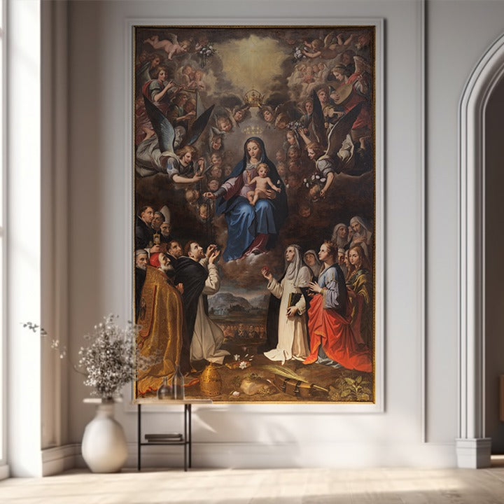Transform your space with the Rosary Queen Glory wallpaper, inspired by the magnificent painting of Madonna Queen of Rosary in her Glory by Giovanni Bernardo Azzolino (1612-1614). This exquisite design, reflecting the Roman grandeur and religious artistry of the Basilica di Santa Maria della Sanità in Naples, Italy, brings the timeless beauty of 17th-century Italian Renaissance art into your home. Perfect for those seeking sacred decor and historical wall art, this wallpaper captures the essence of divine elegance and spiritual reverence