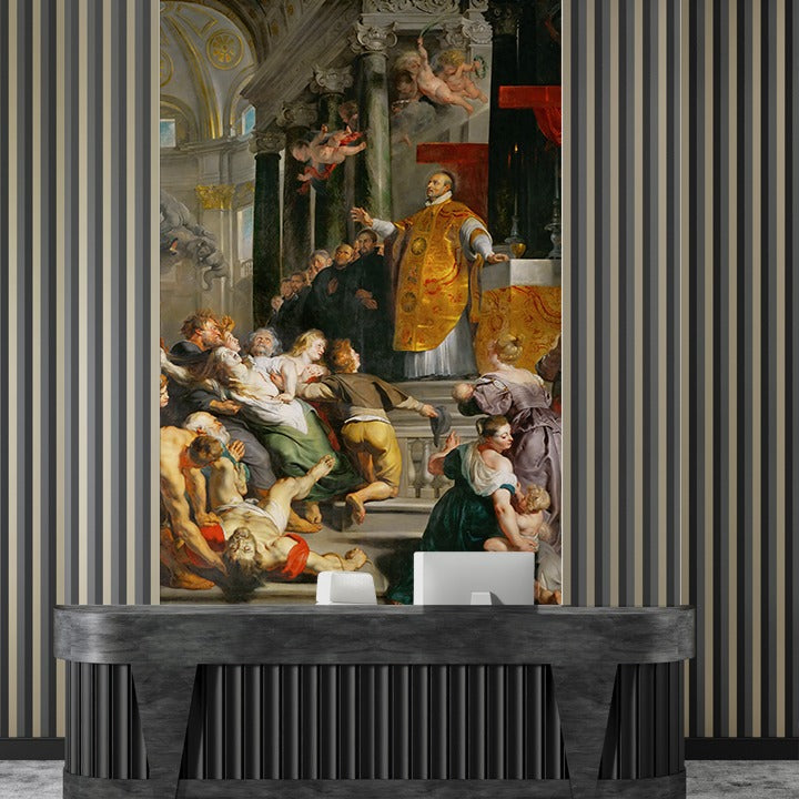 Transform your space with the timeless elegance of 'Rubens' Miracle,' a wallpaper inspired by Peter Paul Rubens' masterpiece, Miracle of Saint Ignatius of Loyola. This exquisite design captures the grandeur and emotion of the baroque era, bringing a touch of historical art into your home. Perfect for creating a sophisticated and cultured ambiance, this wallpaper is ideal for living rooms, libraries, or any space where classic beauty is cherished. Let the divine artistry of Rubens' work elevate your interiors, offering a stunning backdrop that celebrates the beauty of classical painting.