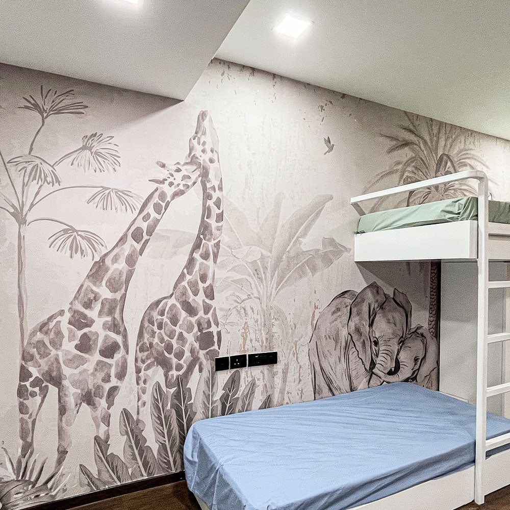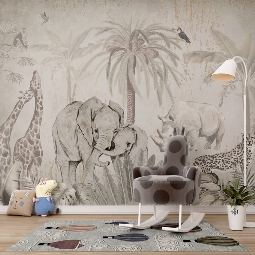 This captivating Safari wallpaper design imbues any room with a tropical vibe, featuring a range of exotic animals like elephants, a giraffe, rhinoceros, cheetah and monkey. The mural also showcases the loving bond between mother and baby elephants, adding an endearing touch to the design. Perfect for all ages, this mural transports you to a lush and vibrant world of the animal kingdom, full of life and energy. Whether you're a nature lover or just looking to add a touch of adventure to your space, this mural is sure to leave a lasting impression.