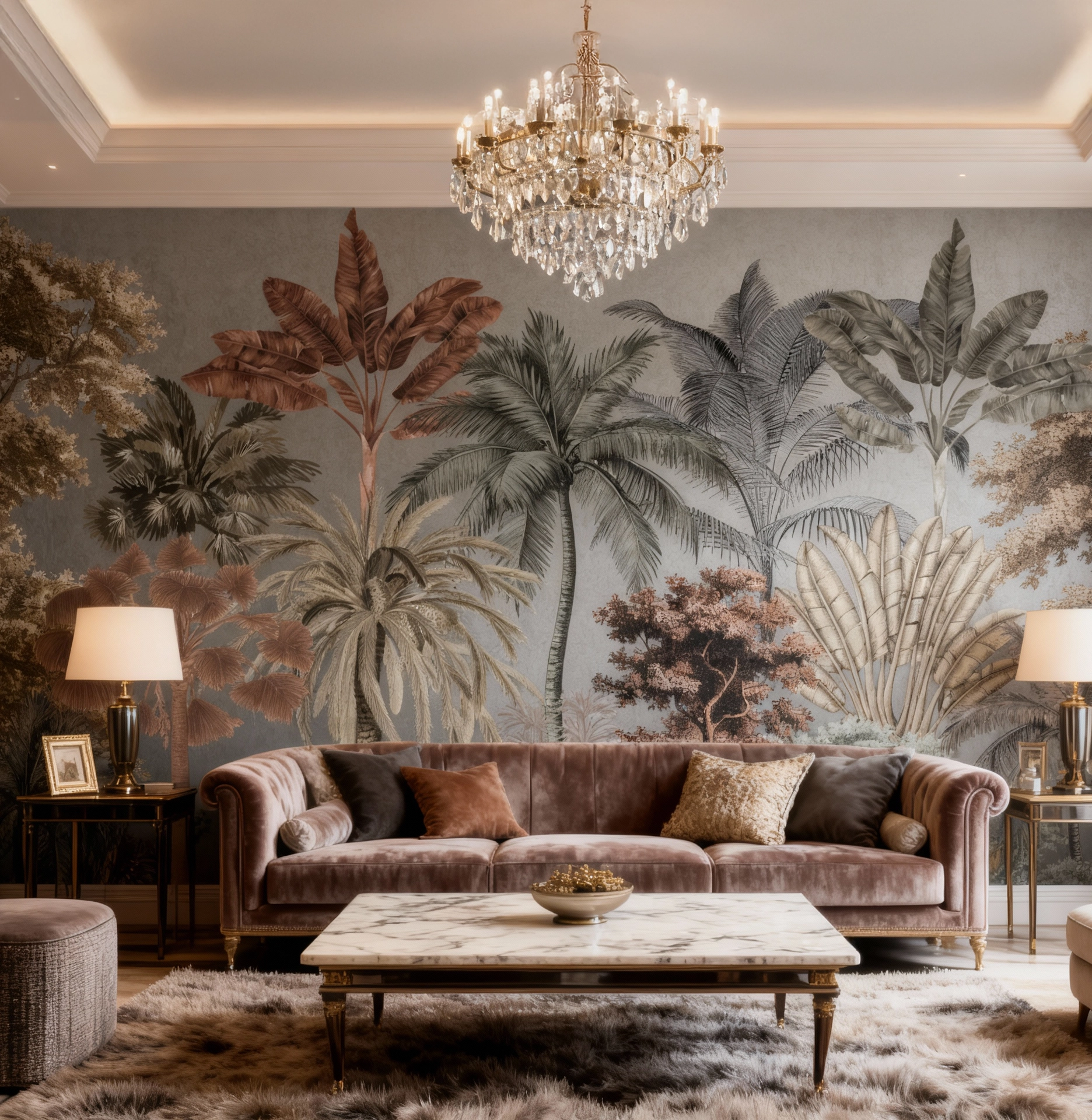 Shadow Tropics Wallpaper creates depth and drama with overlapping tropical leaves and rich tones, perfect for bold and sophisticated interiors.