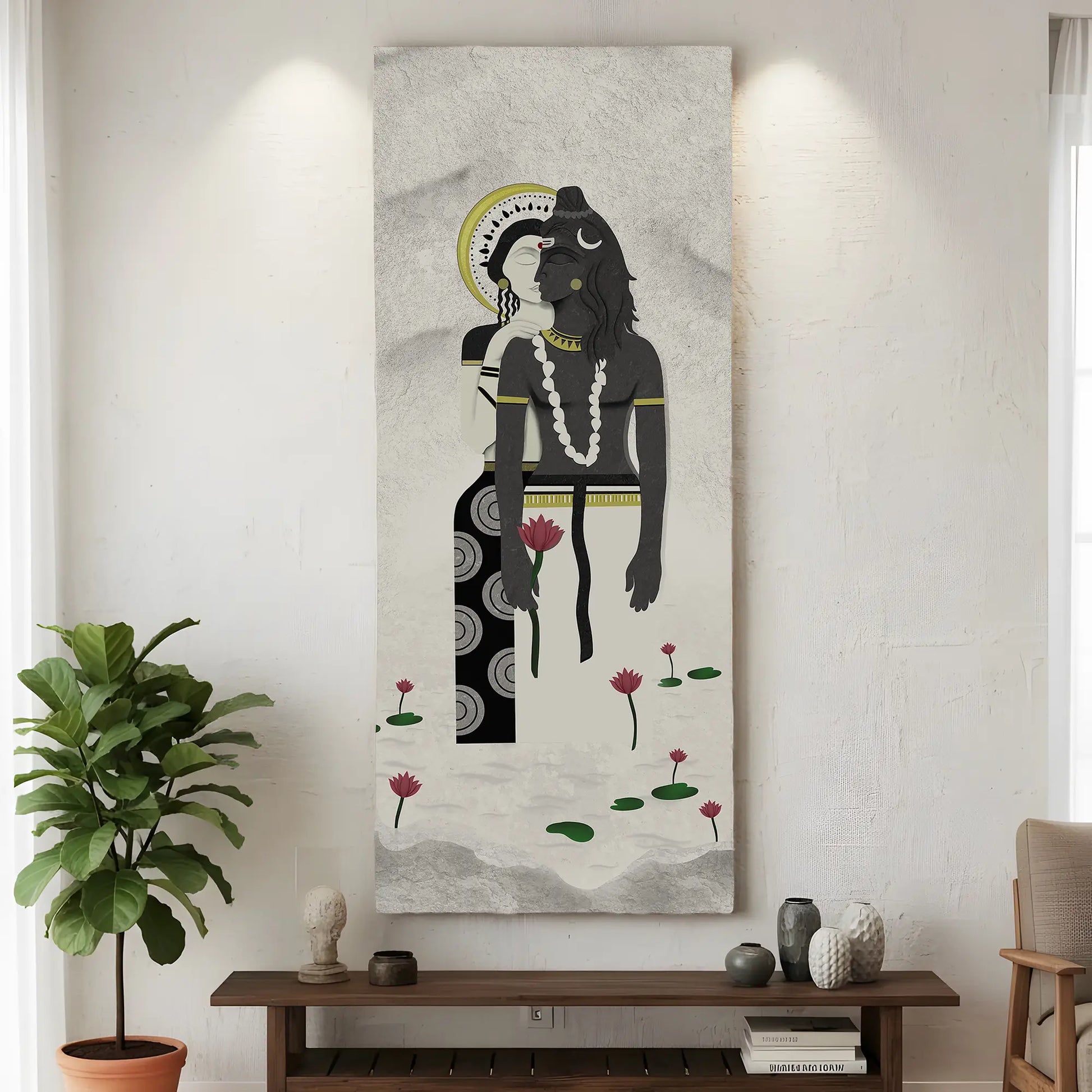 Ardhanari Wallpaper from the God Collection symbolizes cosmic harmony through the union of Shiva and Shakti. With intricate detailing and serene artistic expression, it adds a spiritual aura, making it ideal for meditation corners, pooja rooms, and peaceful interiors.
