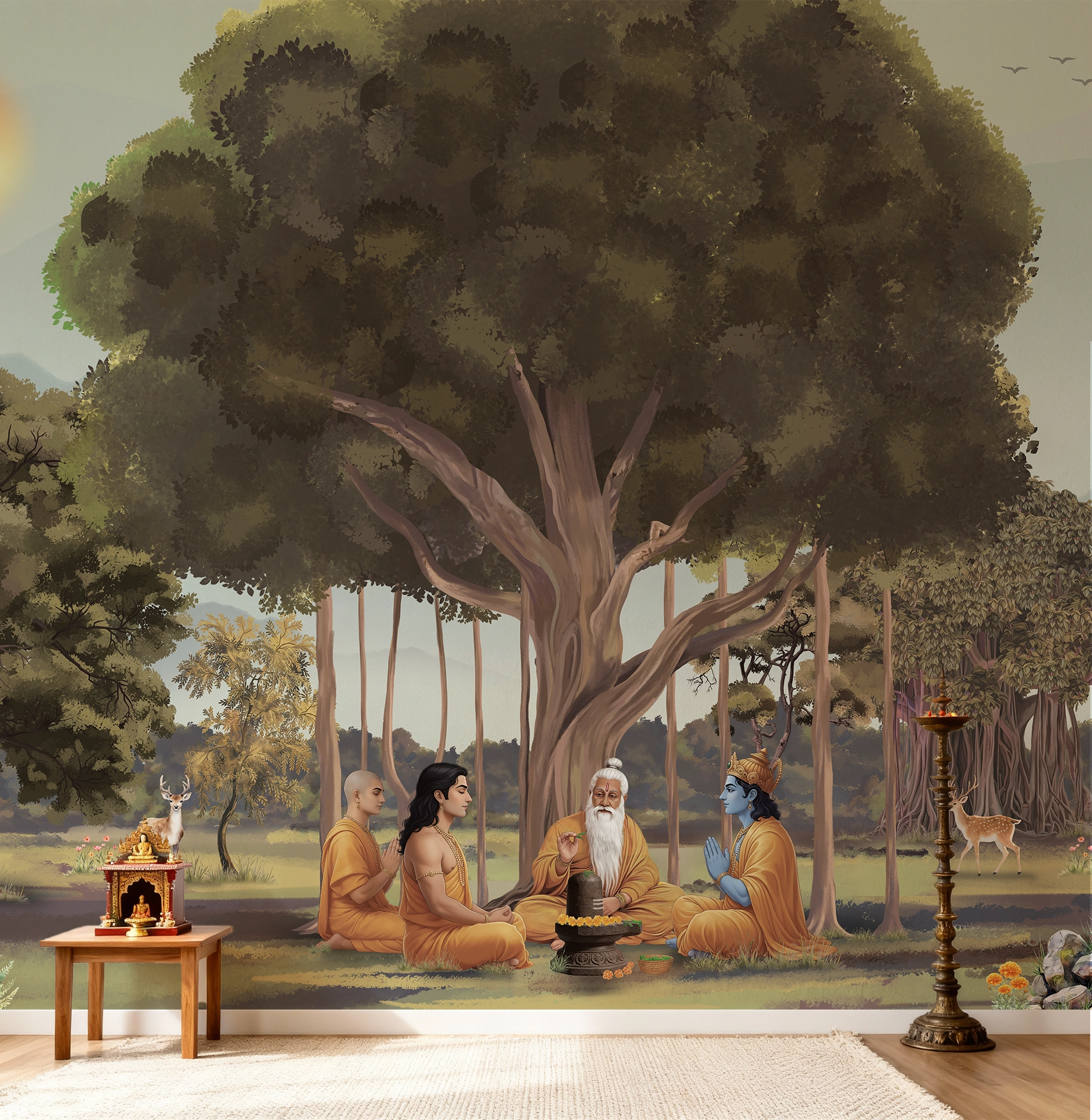 Tapo Bhumi Wallpaper reflects sacred landscapes and spiritual calm, making it ideal for meditation areas, pooja rooms, and peaceful interiors.