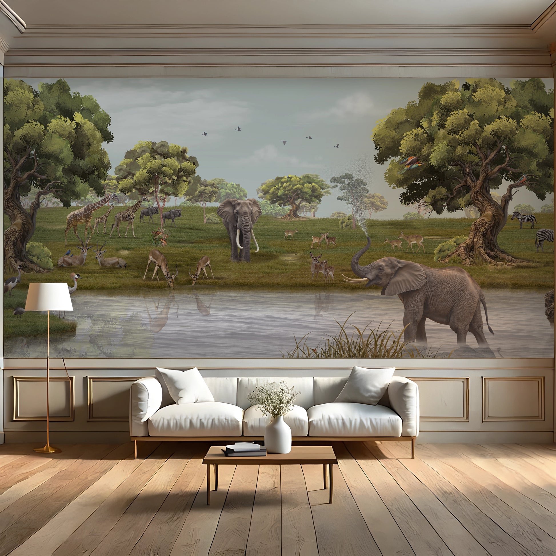The Great Gathering Wallpaper blends the charm of tropical nature with kid-friendly storytelling. Featuring cheerful animals, lush greenery, and soft inviting colours, it creates a joyful environment perfect for kids’ rooms, play areas, and creative spaces while adding a refreshing tropical vibe.